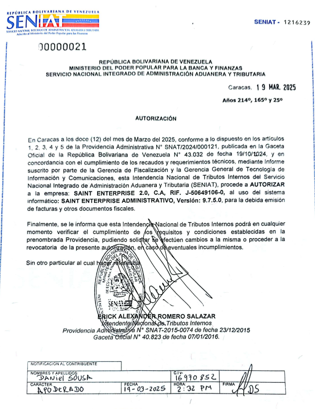 Para su total tranquilidad, SAINT ENTERPRISE. Cuenta con la Autorización oficial del SENIAT según la Providencia Administrativa N° SNAT/2024/000121. Nuestro software, SAINT ENTERPRISE ADMINISTRATIVO (Versión: 9.7.5.0), cumple rigurosamente con todos los requerimientos técnicos y legales para la debida emisión de sus documentos fiscales. Como su proveedor certificado, emitimos el Comprobante de Licencia de Sistema Homologado, el cual sirve como su aval técnico-legal ante cualquier inspección.