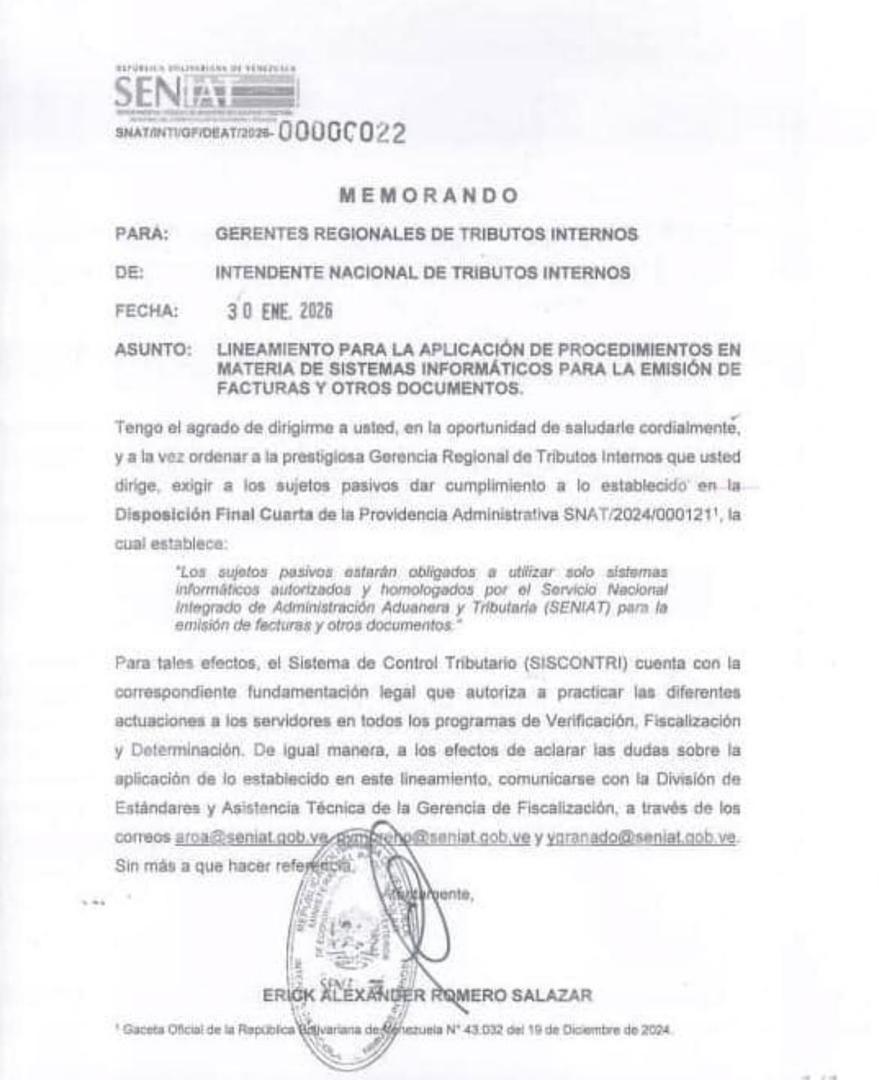 En cumplimiento con los recientes lineamientos del SENIAT (Memorando SNAT/INTI/GFIDEAT/2026-00000022), se informa a todos los contribuyentes la obligatoriedad de utilizar exclusivamente sistemas informáticos autorizados y homologados para la emisión de facturas y documentos fiscales. Esta medida busca garantizar la transparencia tributaria y facilitar los procesos de fiscalización ejecutados a través del Sistema de Control Tributario (SISCONTRI).