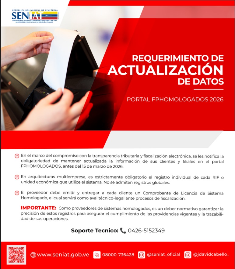 En el marco del compromiso con la transparencia tributaria y la fiscalización electrónica, recordamos a todos nuestros usuarios la obligatoriedad de mantener actualizada la información de sus clientes y filiales en el portal FPHOMOLOGADOS, teniendo como fecha límite el 15 de marzo de 2026. Es fundamental destacar que, en arquitecturas multiempresa, cada RIF o unidad económica que utilice el sistema debe registrarse de manera individual, ya que no se permiten registros globales.